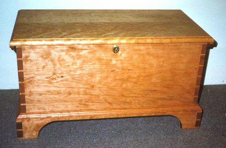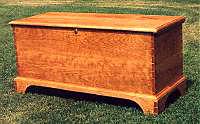 Shaker Style Cherry Wood Chest with a natural hand rubbed penetrating oil finish, based on the original wide-board pine chest displayed at the Hancock Shaker Village, Mass. The chest is dovetailed on all 4 corners as well as the base. There is plenty of room for storage and includes two boxes or "Tills" (one at each end) to safely store those smaller items. (Click for picture with Chest open.) The chest measures 23 1/2" high, 48" wide , and 19 3/8 " deep Typical Price: $1675.00 |